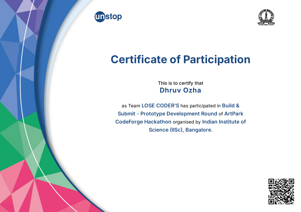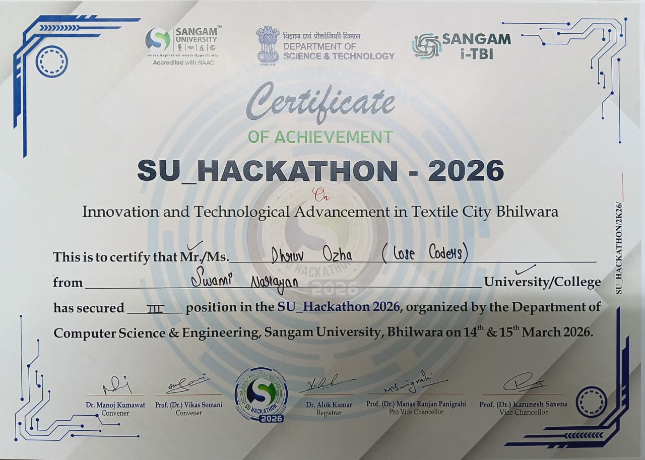 Competed at SU Hackathon 2026 (3rd Place) and IISc ArtPark CodeForge